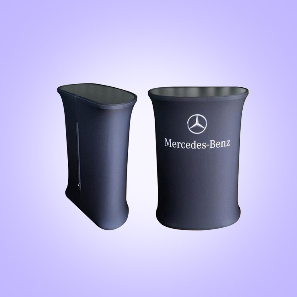 These counters consist of two primary elements: a robust yet lightweight frame and a fully printed stretch fabric that is tailored to fit securely over the frame, ensuring a polished appearance. The stretch fabric is easily interchangeable and can be laundered in a machine.